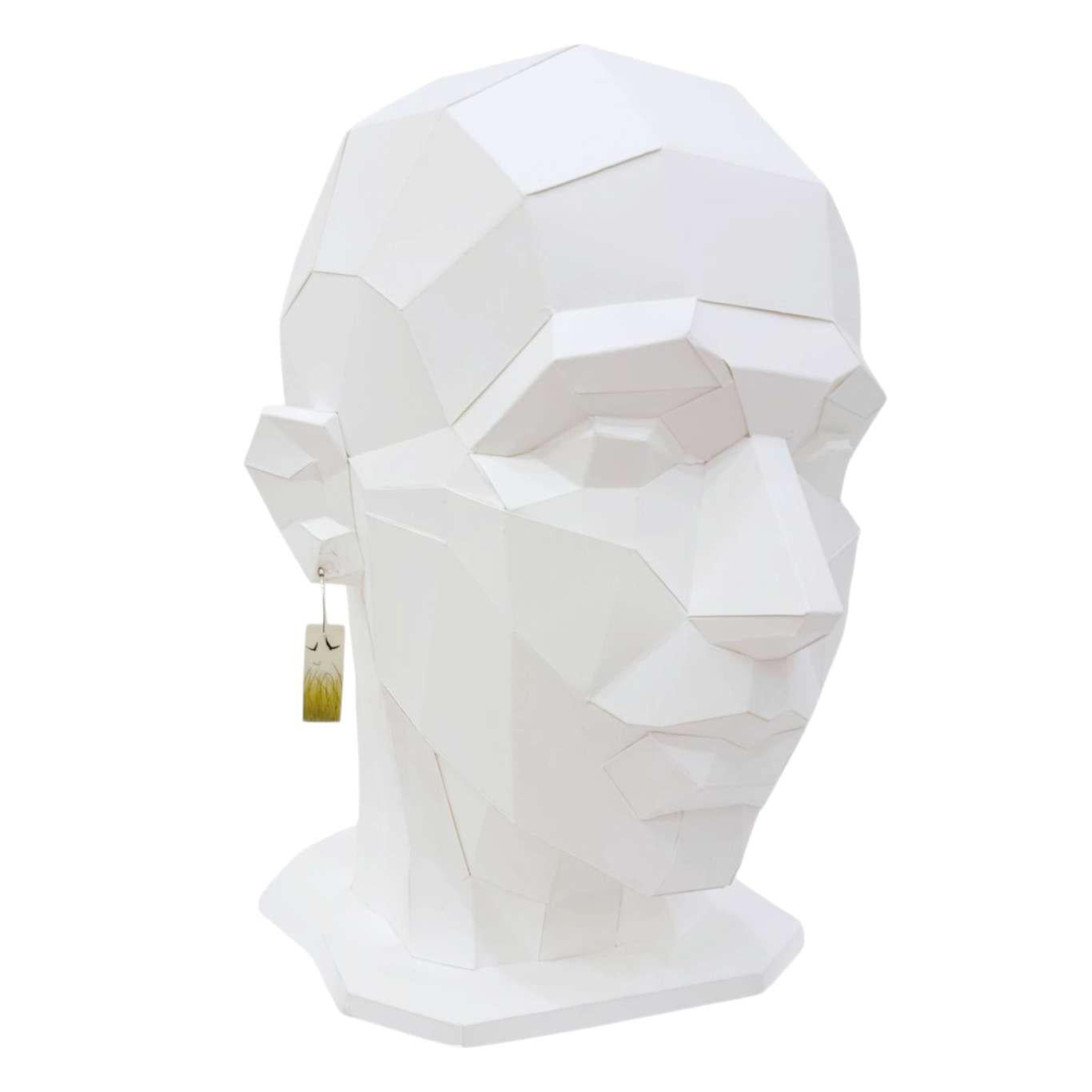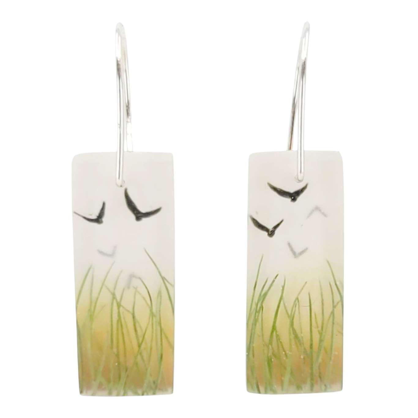These long drop earrings feature a flock of birds silhouetted over a grassy field made with real grass.