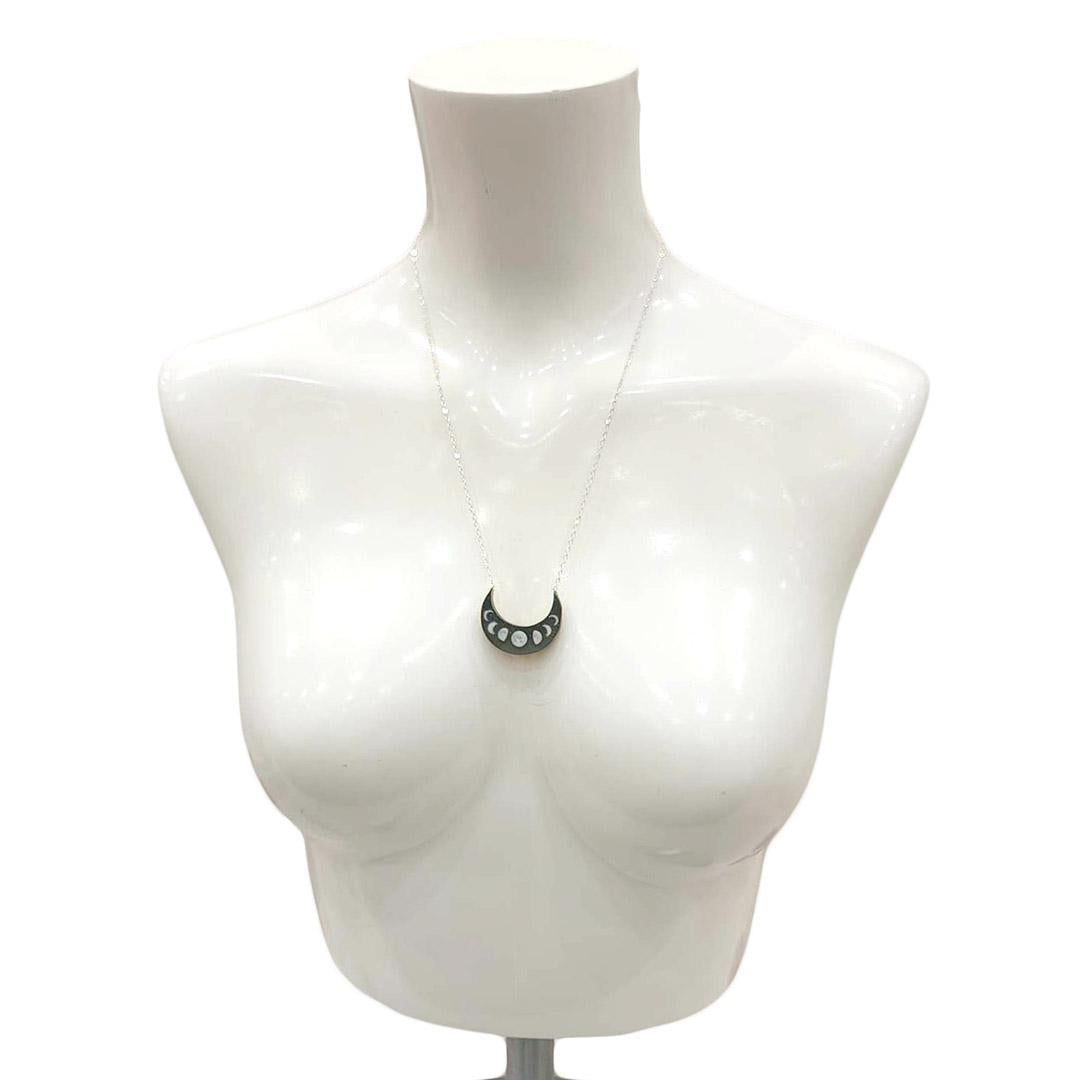 Crescent-shaped 3-D lunar phases necklace. Hand painted with acrylic paint, ink, and a touch of sparkly glitter paint, the scene is then layered in polished resin with a thin wood backing and strung on a delicate silver chain.