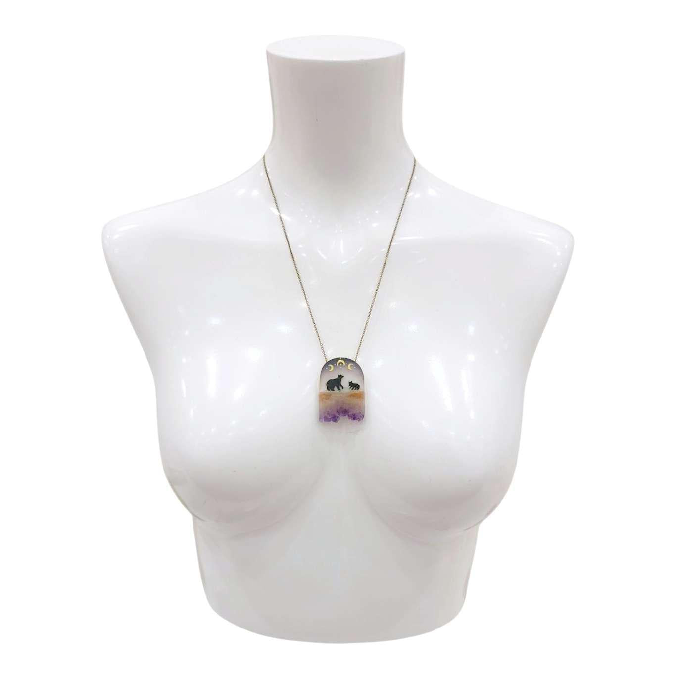 This stunning necklace features a mama bear and her cub silhouetted against a night sky with golden moons, accented by a slab of real amethyst or jasper.