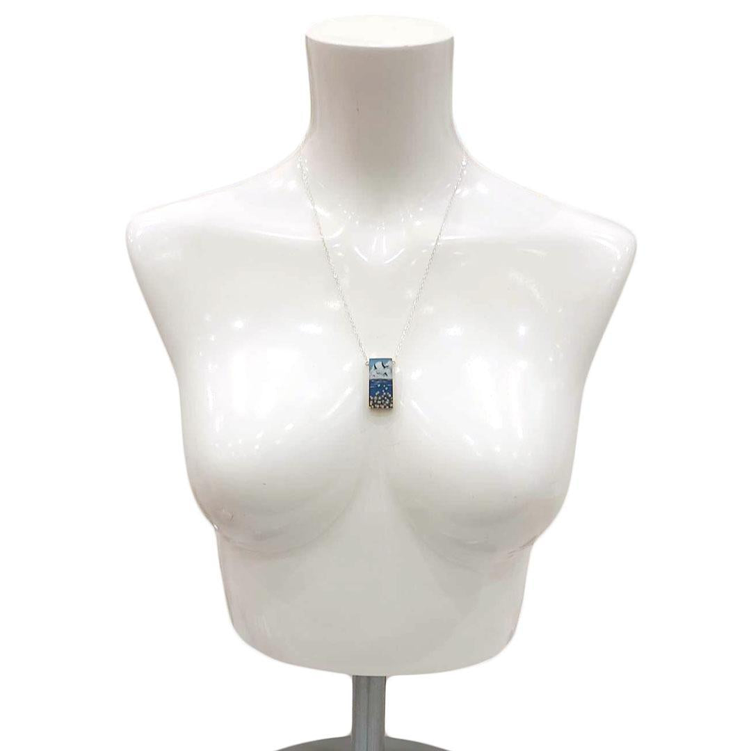 • Layered resin, acrylic paint, wood, stone, and gunmetal silver chain.