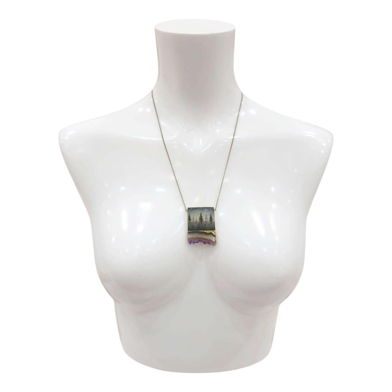 This stunning necklace features a forest with deep layers of roots, earth, and trees visible beneath a starry night sky, accented by a slab of real amethyst or jasper.