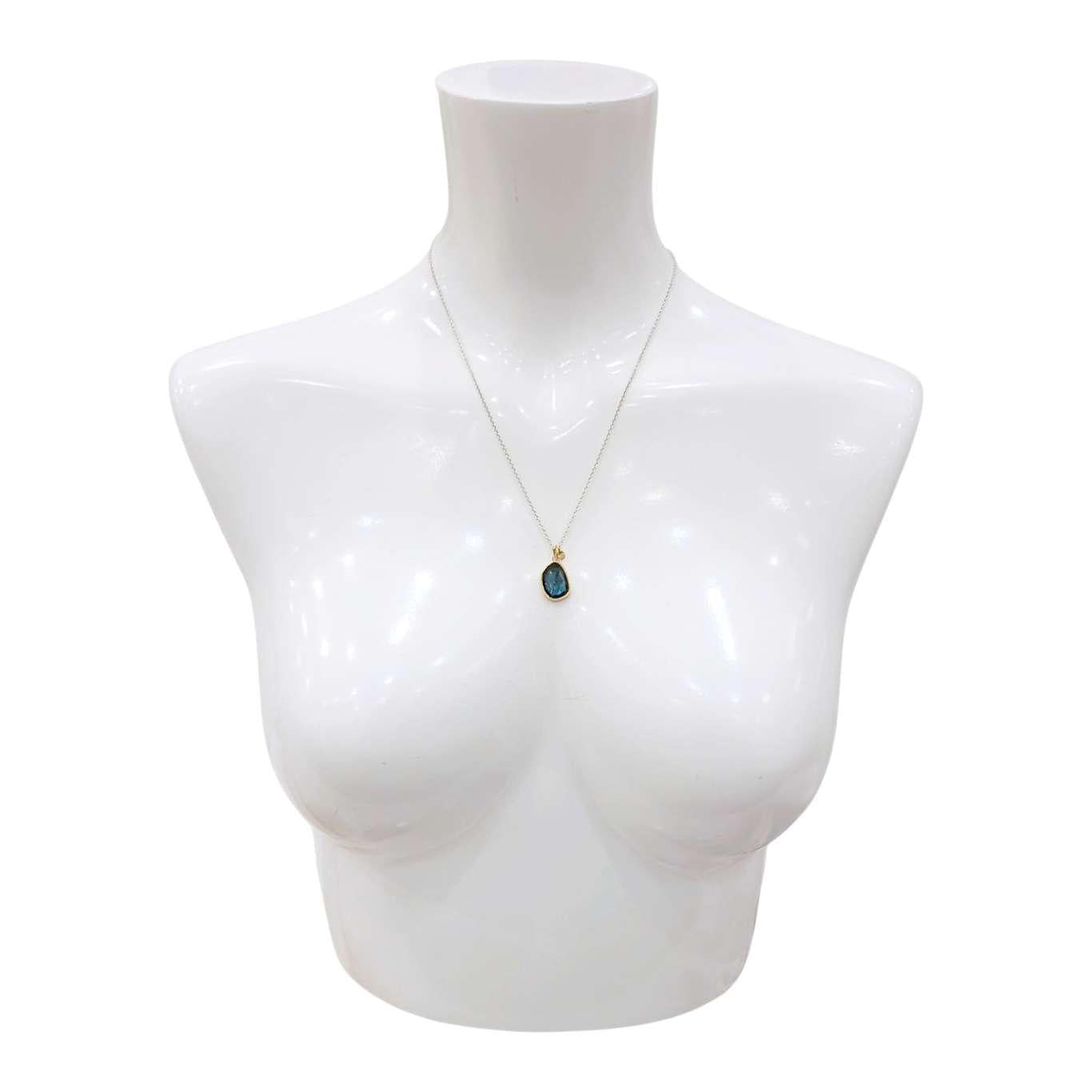 A stunning denim-colored London blue topaz is wrapped in 14k gold, accented with a tiny diamond in an engraved gold sunburst, and hung on a sterling silver chain to make a gorgeous and versatile necklace.