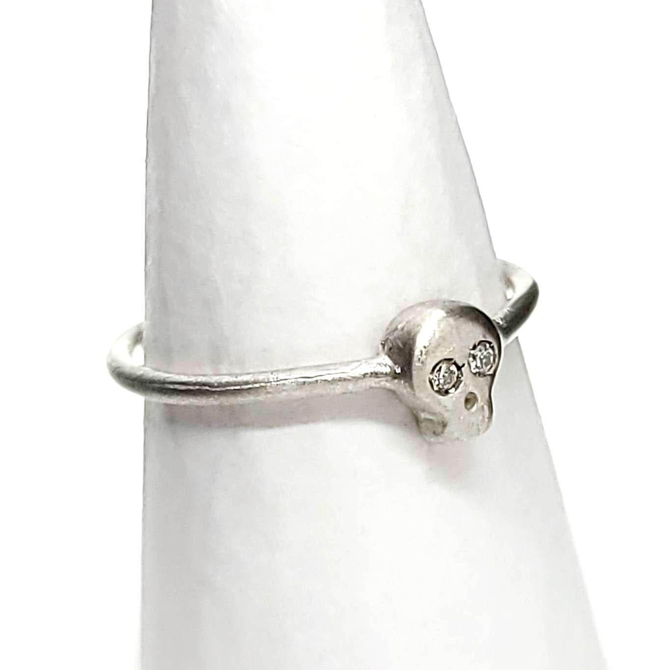 Perfectly walking the line between cute and edgy, this ring features a tiny skull with piercing diamond eyes! Simple band is made of sterling silver with a brushed satin finish.