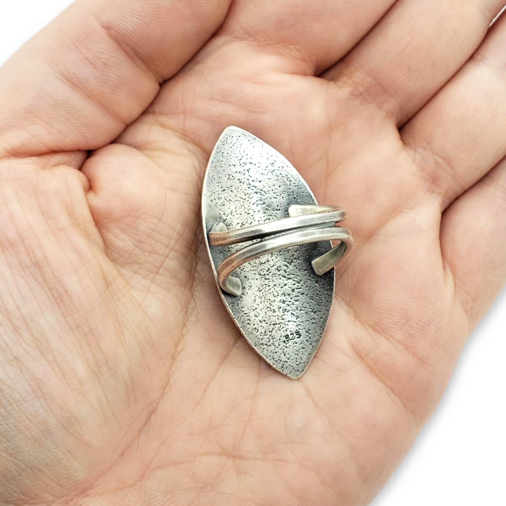 A stunning rose-cut natural ruby is set on a marquis-shaped background featuring beautifully detailed tectonic fracturing. Una Barrett’s incredible metalwork combines the contemporary with the prehistoric in a style that’s sometimes organic, sometimes industrial, and always jaw-dropping.