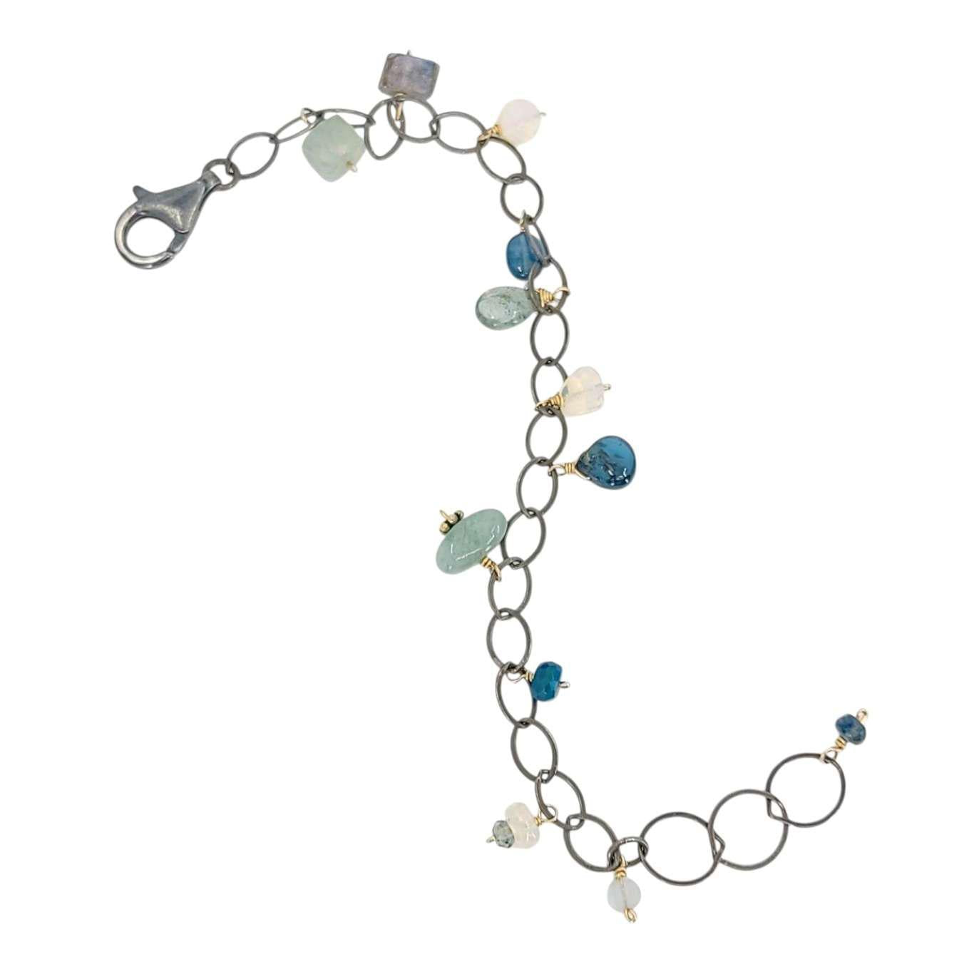 This lovely bracelet features dangling opal, kyanite, and aquamarine gemstones in a variety of shapes with delicate gold fill accents.