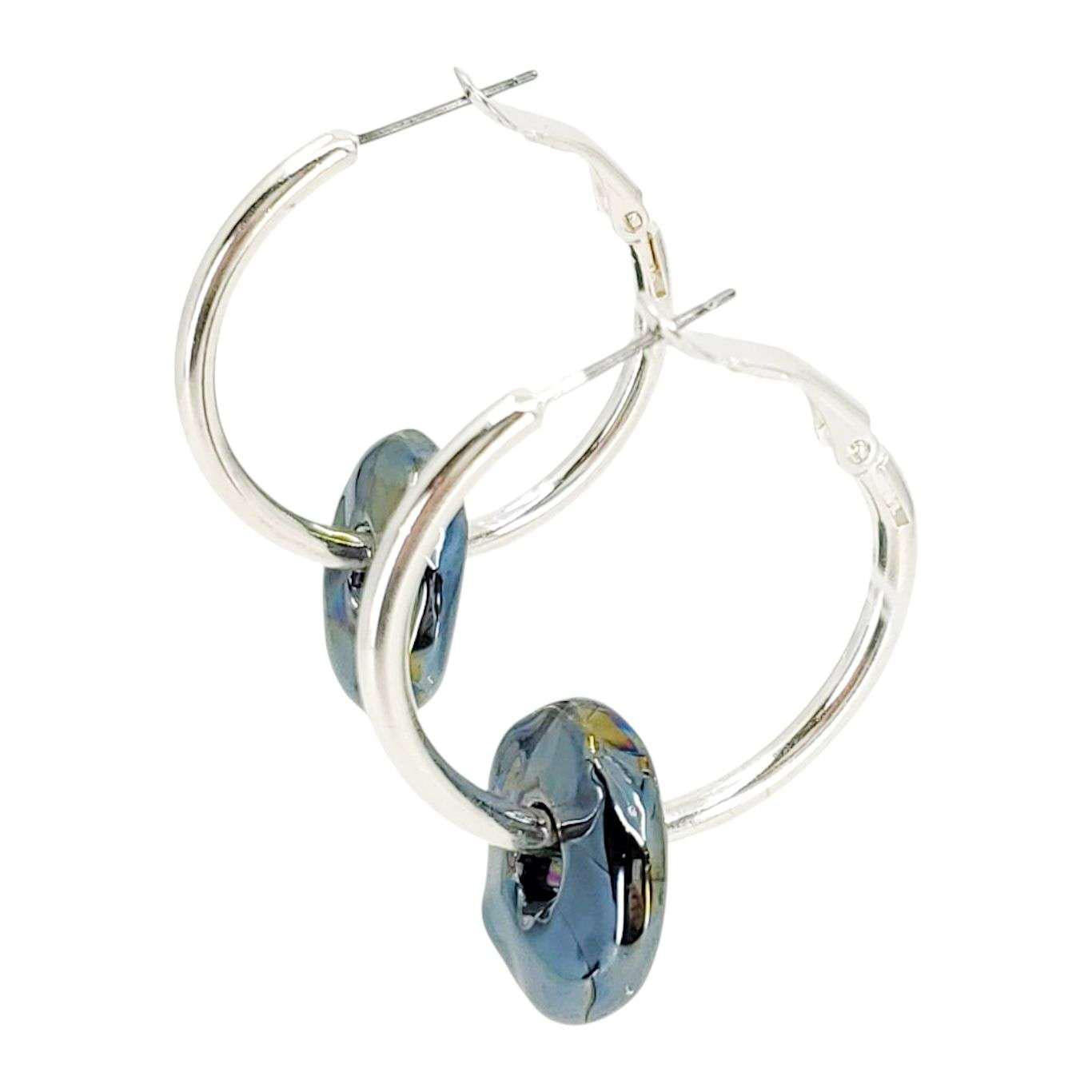 These bold, eye-catching earrings feature hand-formed ceramic wafer beads in deep black finished with iridescent Italian glaze and dangled from bright silver hoops.
