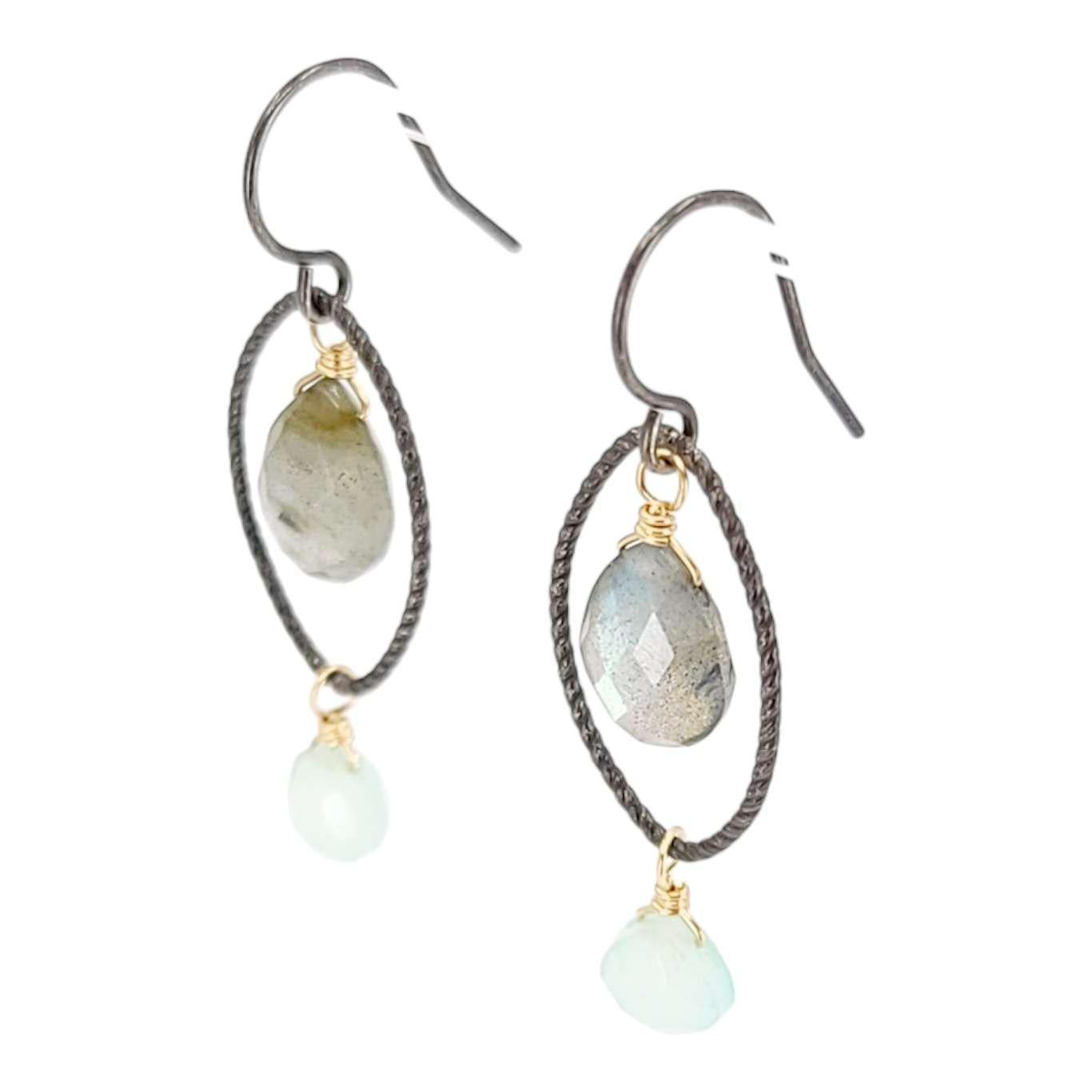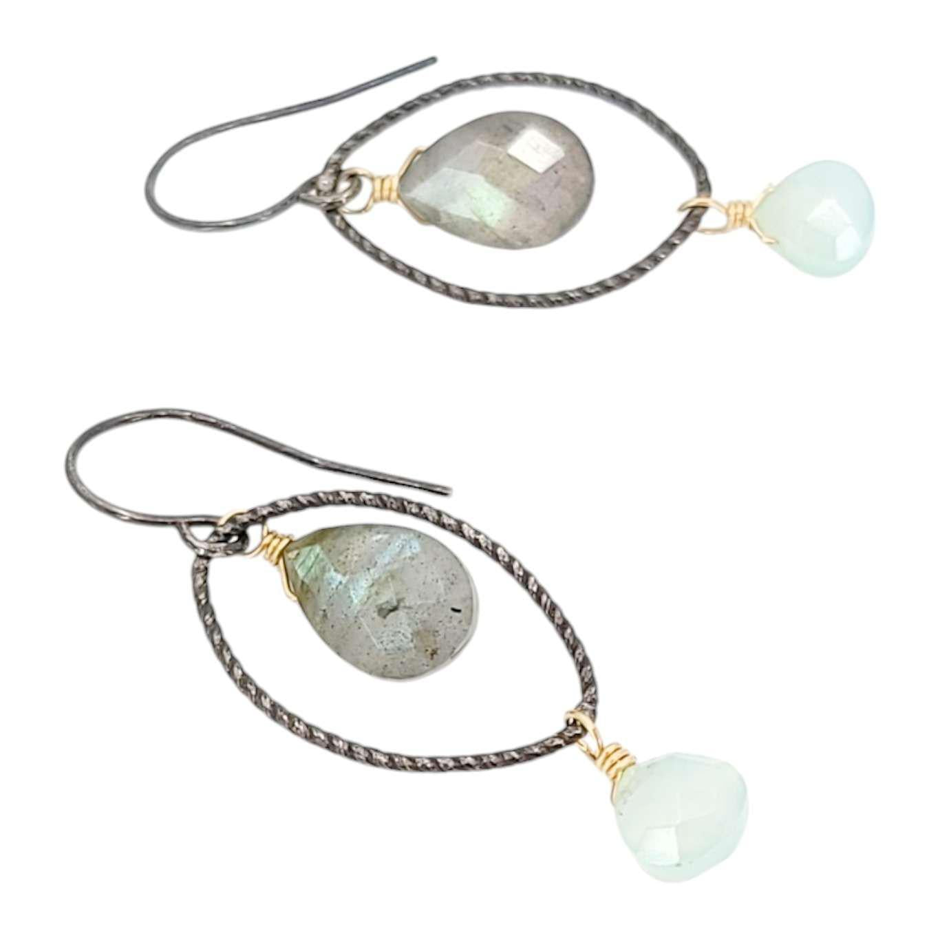 These beautiful earrings feature textured ovals of oxidized sterling silver with gold fill accents and two gemstone drops, with labradorite nested in the oval and soft aqua chalcedony drops dangling below.
