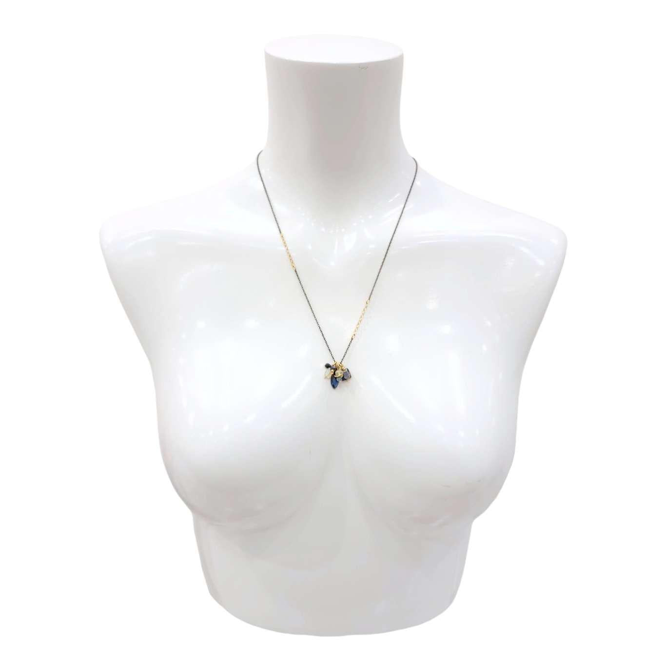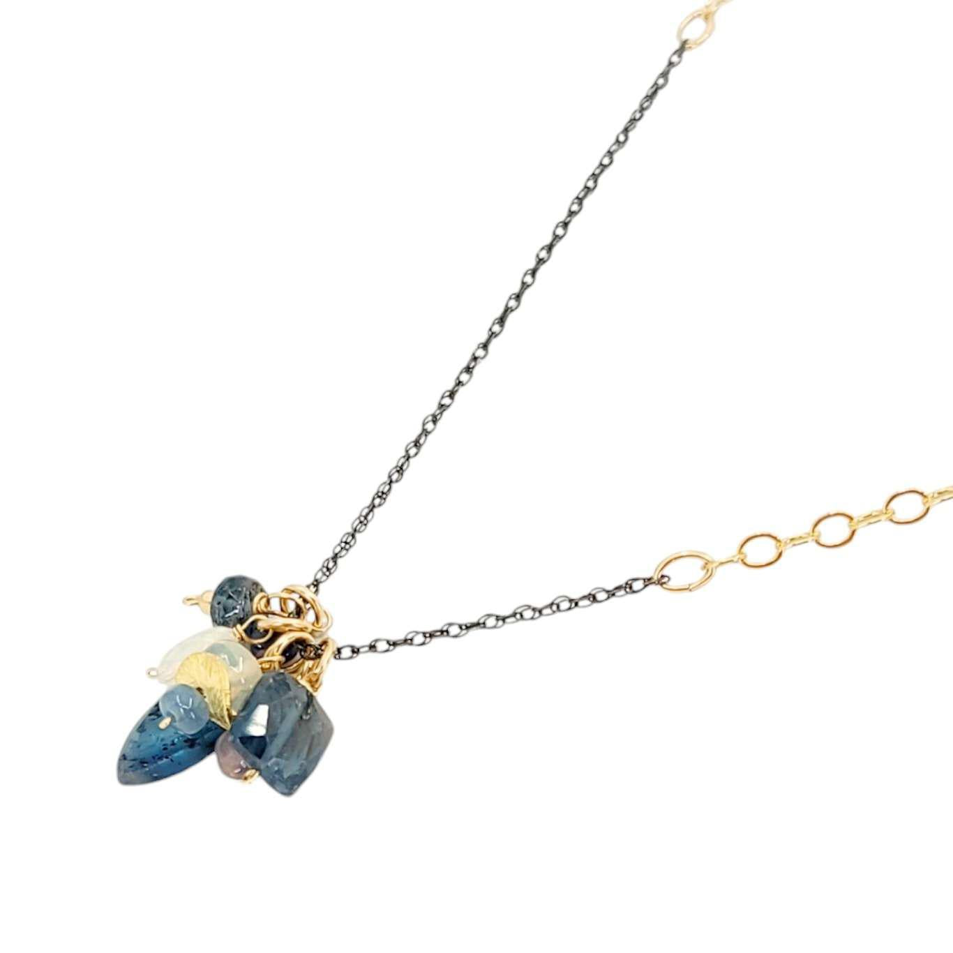 A lovely cluster of blue moss kyanite and colorful opals accented with 14k gold fill hangs on an oxidized sterling silver chain with contrasting gold fill sections.