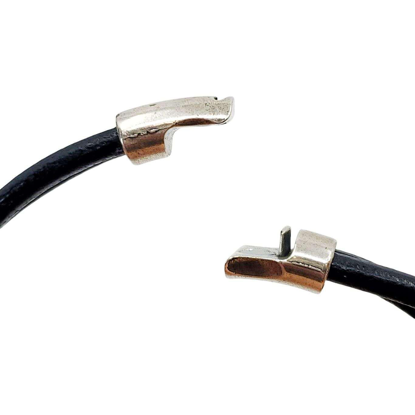 The two leather bands are slightly offset to create a graceful curve that perfectly wraps around the neck.