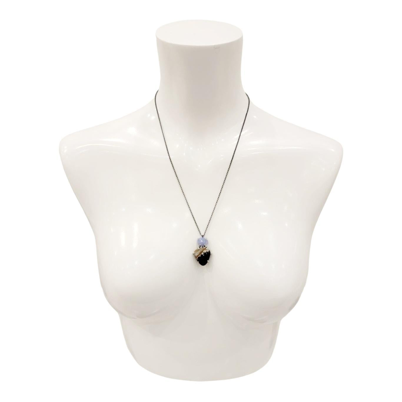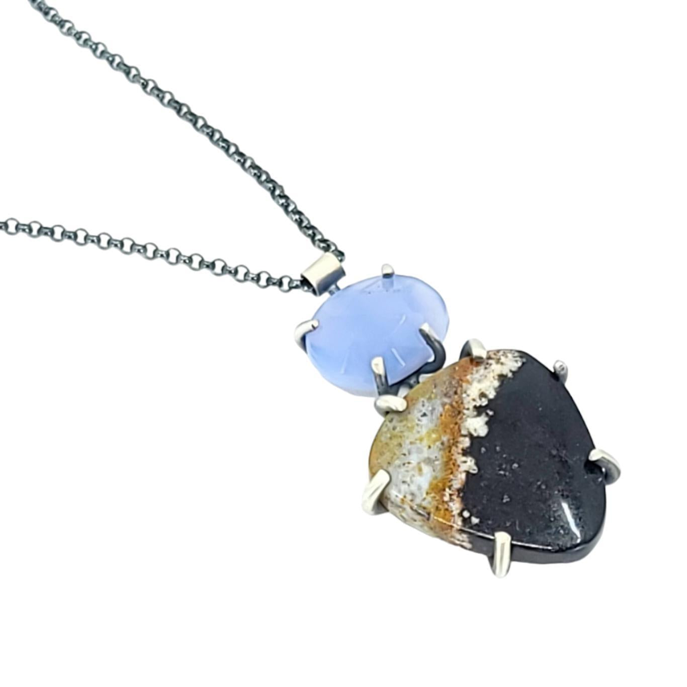 Faceted periwinkle chalcedony is mounted over a smooth triangular cabochon of beautiful opalized wood, both held with bold hand-fabricated prongs on an oxidized sterling silver rolo chain.