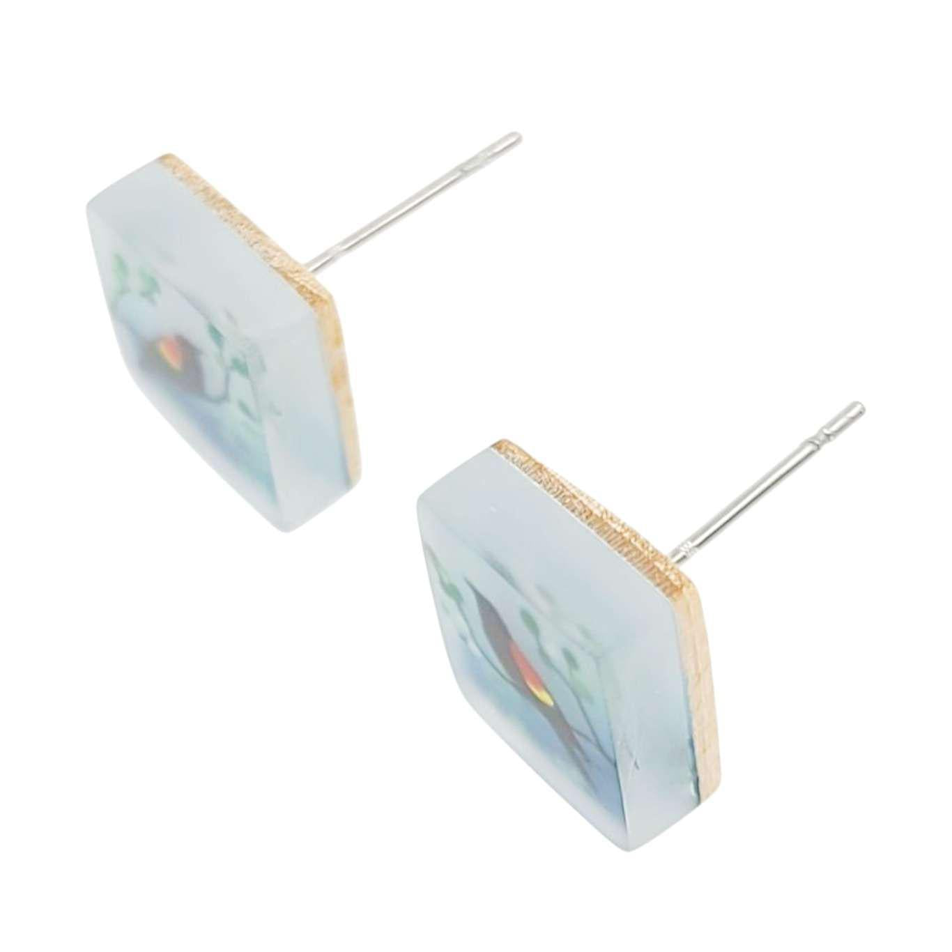 These square stud earrings feature red wing blackbirds perched on leafy branches.