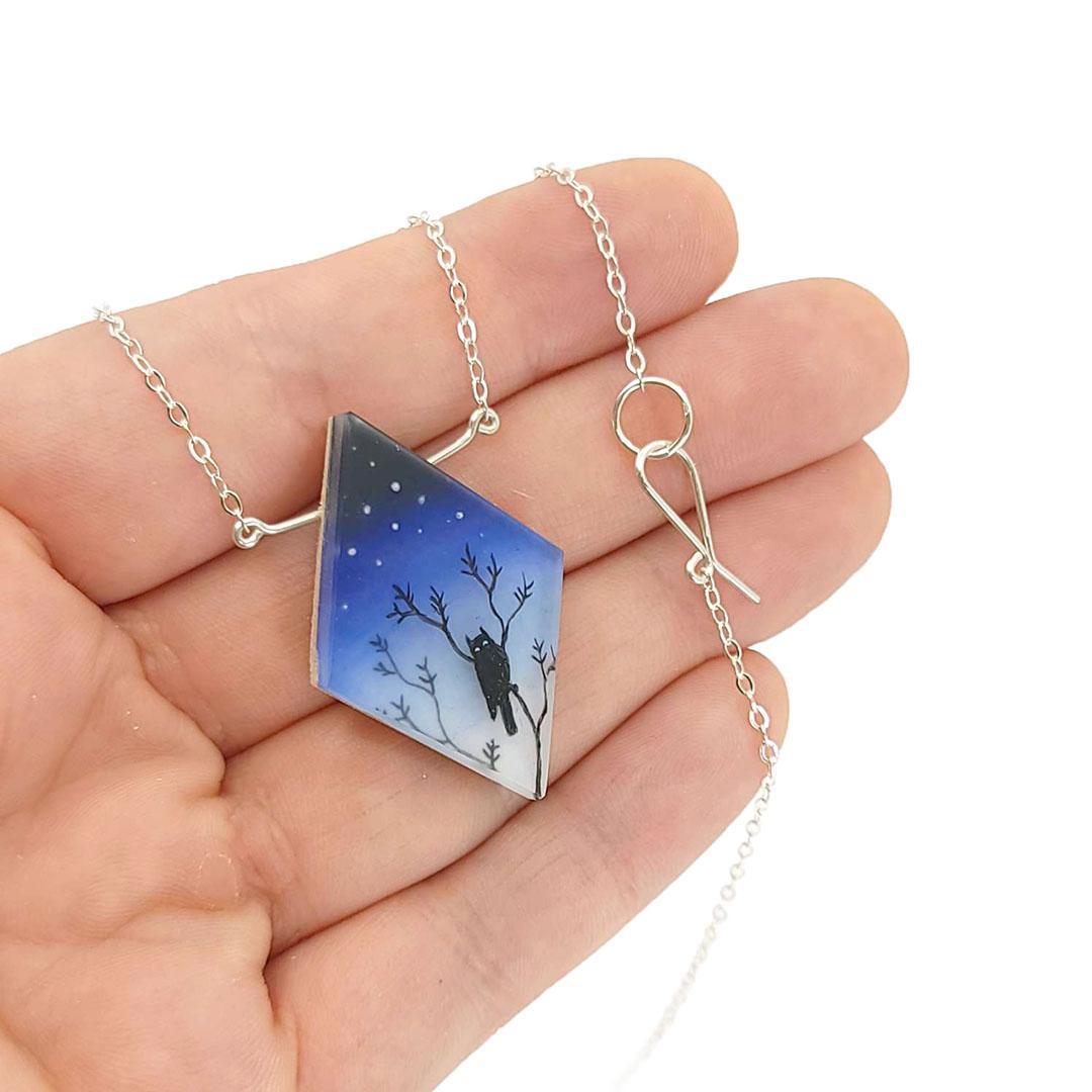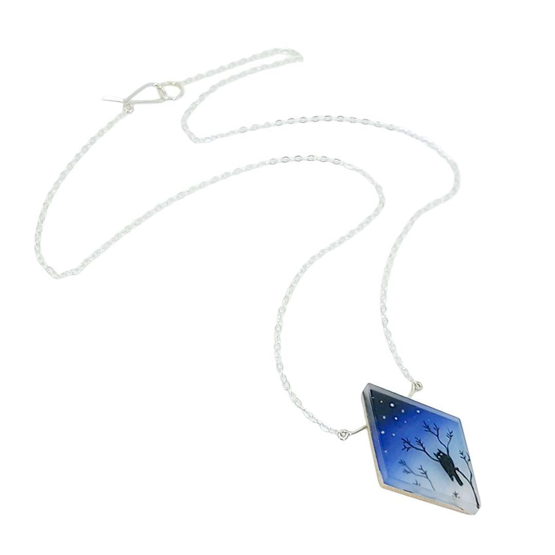 A kite-shaped pendant hanging from a bar of bright sterling silver features a mysterious owl hiding amongst silhouetted branches under a starry cobalt blue night sky.